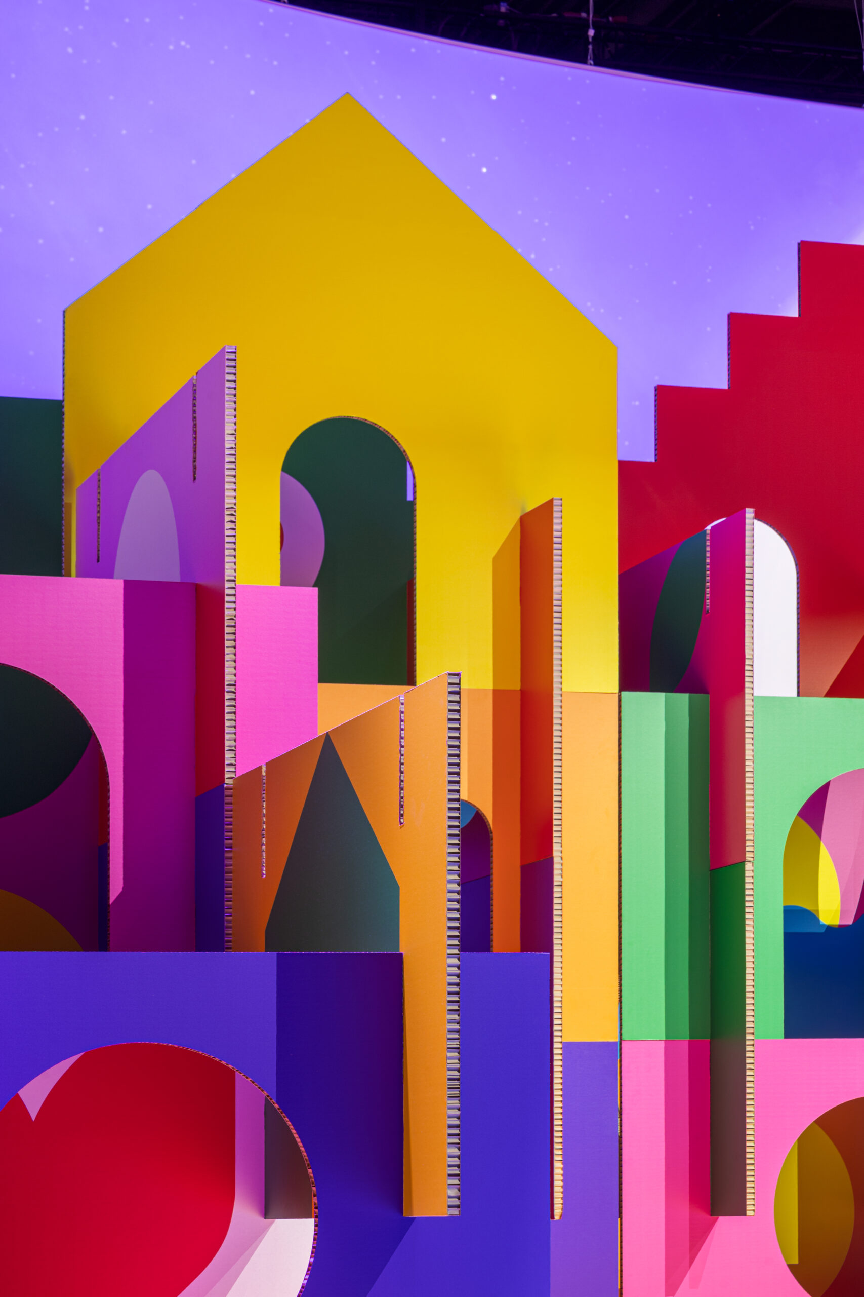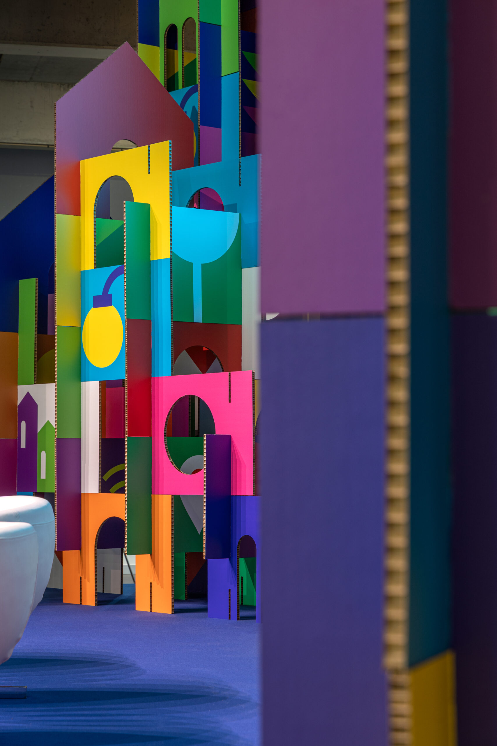 For the 2025 edition, design becomes the conceptual axis of the project. The artistic direction opts for a visual language inspired by children’s building blocks: printed cardboard pieces that, when assembled, create the structures of the theatres, common areas and various key points of the congress. This modular and expressive system defines a distinctive aesthetic, transforming the space into an immersive experience that accompanies and enhances the identity of the event thanks to the materials used.